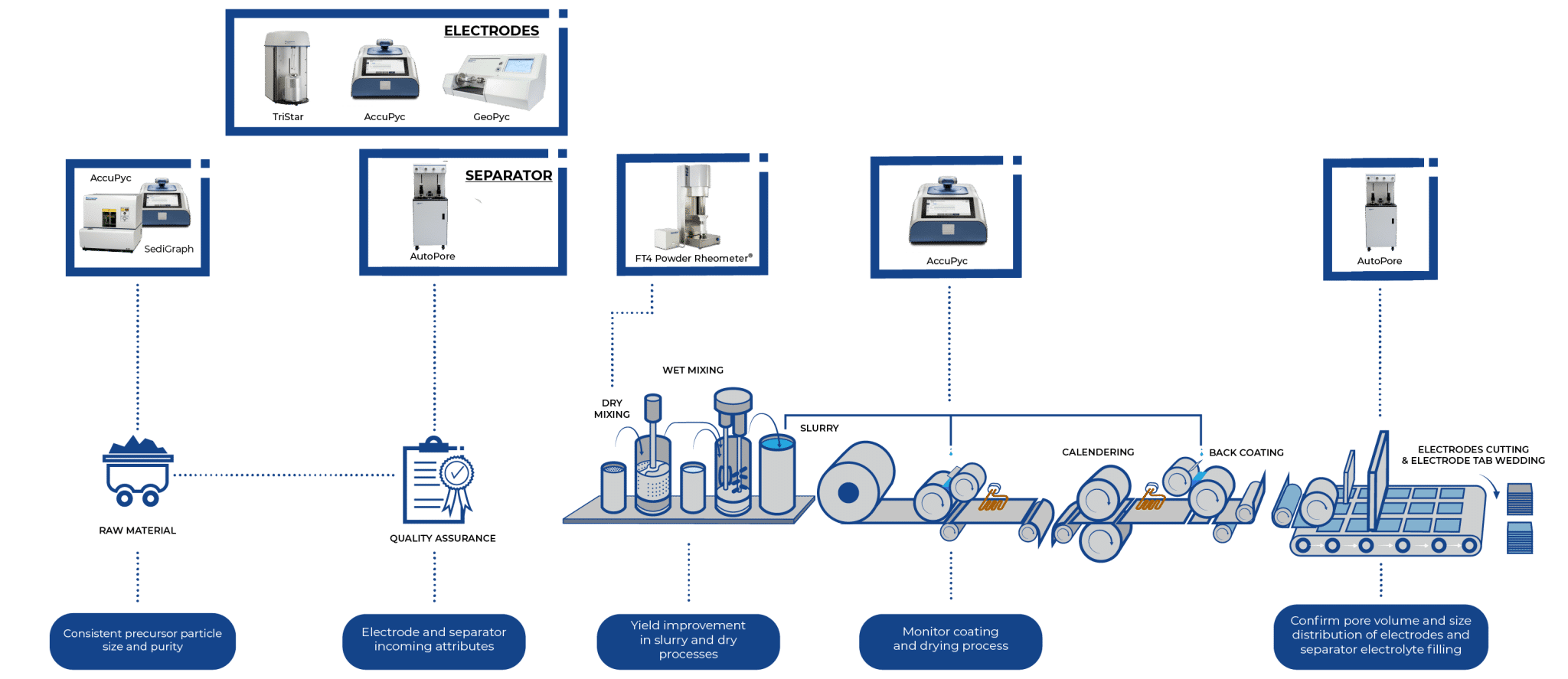 在 Micromeritics,我们拥有适用于电池生产所有阶段的仪器,从原材料前体到最终的电池单元。