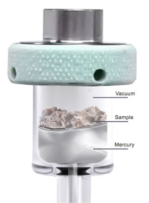 压汞仪分析技术是基于在精确控制的压力下将汞压入孔结构中的方法实现的。除快速、精确及分析范围广(一般为 3 纳米至 600 微米)等优点外,压汞仪还允许用户计算得到众多样品特性,例如:孔径分布、总孔体积、总孔比表面积、中值孔径及样品密度(包裹密度和骨架密度)。