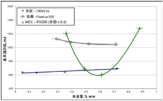 其中微晶纤维素 ( MCC ) 物料的基本流动能 ( BasicFlowability Energy,BFE)数值特别有意思。它对水含量的敏感性极高,却同时呈现非线形的变化。这有可能是由于其静电力和颗粒间的液相桥接综合作用的结果。