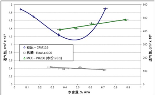 使用透气性测试评估气体通过粉末的能力时,同样的粉末材料产生与上面不同的反应。这里石灰石粉末对含水量的敏感性最高,亦展示出非线性变化。这是由颗粒团聚和结块行为两种效应的平衡所决定的。