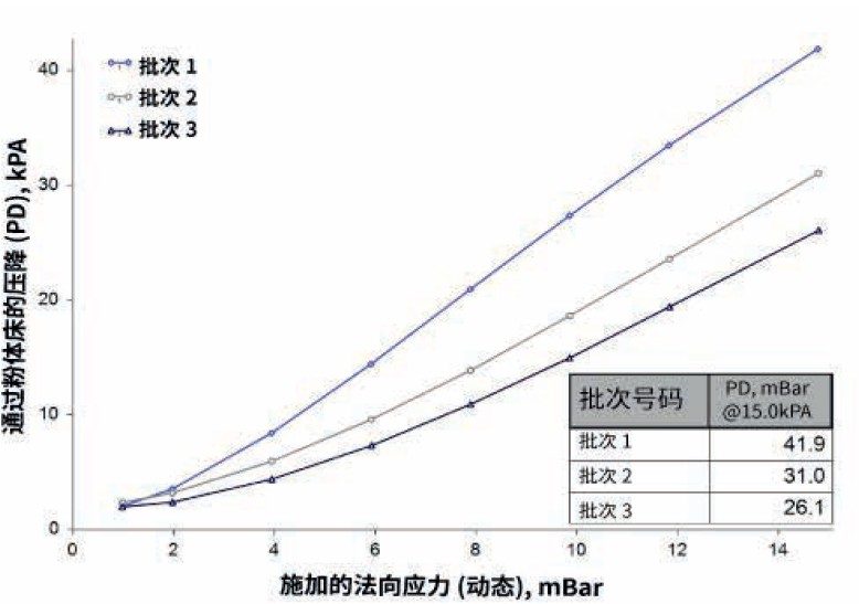 透气性描述粉体释放和滞留空气的能力。批次1所测得的高的压降(PD)表明低的透气性, 从而说明较有效的组装粉床。具有规律的组装结构的粉体一般更能自由流动因而也能够较自由和均匀地分散。较低的内聚强度也能减少颗粒团聚。