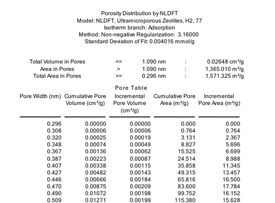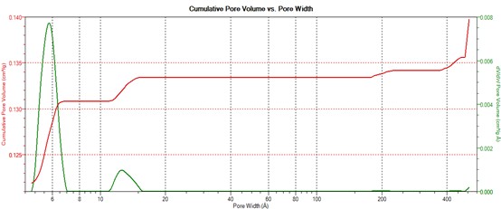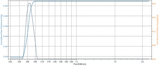 图2中显示了利用液氮温度下的氢气吸附,通过麦克的氢气HS-2D-NLDFT模型,得到了此材料的超超微孔部分,孔径分析的下限达到了0.296 nm。