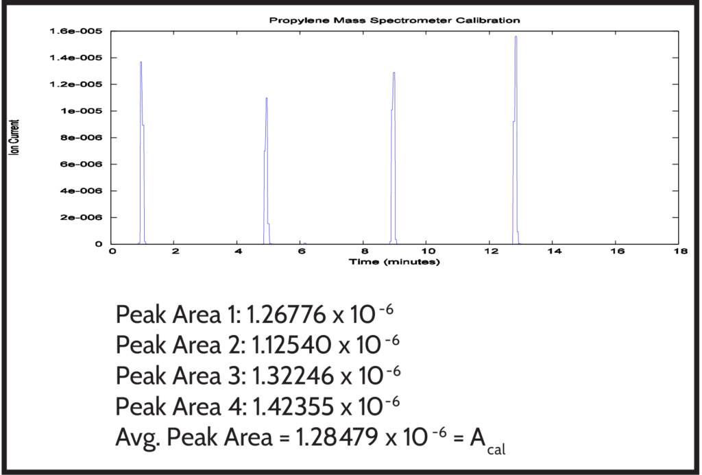 To obtain quantitative data, the mass spectrometer must be calibrated by injecting a known volume of the gas to be detected (propylene), Vcal, through the septum with a highprecision syringe. The peak area of the mass spectrometer signal can be obtained using the AutoChem peak-editing software. To increase the accuracy of the calibration, injections may be made until peaks are similar in area. The areas can then be averaged to give a general conversion factor between mass spectrometer peak area and actual gas volume, allowing for the acidity of zeolites to be calculated. Figure 2 gives an example of this procedure.