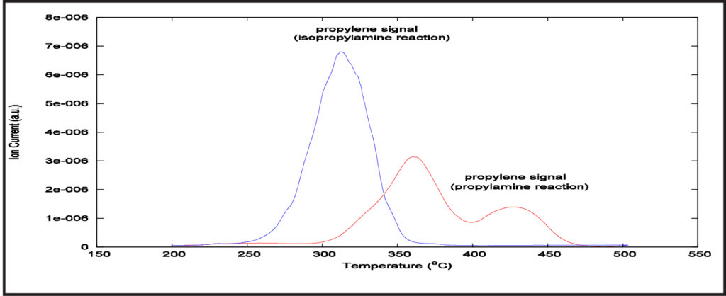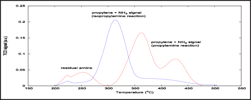 Additionally, Figures 3 and 4 show that a thermal conductivity detection method includes residual amine and ammonia from the chemisorption, whereas mass spectrometer detection isolates the propylene signal, allowing the concentration of acid sites to be calculated.