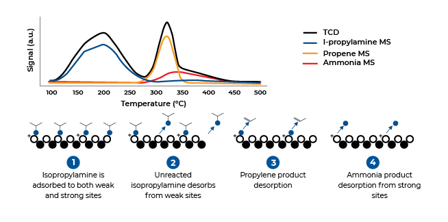 在恒定的惰性流动气体氛围中,以可控速率升高温度。当热能超过结合能时,吸附质从活性位点上脱附出来,由热导检测器检测惰性气体和脱附的分子量。TCD 信号与脱附的分子量成正比。在特定温度下脱附的量提供了关于化学吸附位点的数量、强度和异质性等信息。