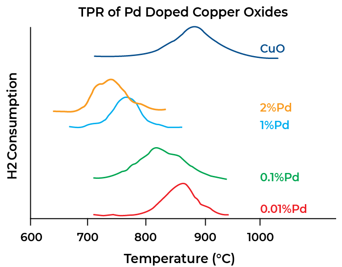 程序升温还原主要用于研究分散在载体上的金属氧化物还原性能。在程序升温过程中,将稀释的氢(或另一种还原气体)通入样品中,测量氢的消耗量和发生还原的温度分布。氢消耗量与温度的关系图有一个或多个峰,获得的数据反应了样品中可还原物种的数量以及它们的活化能。