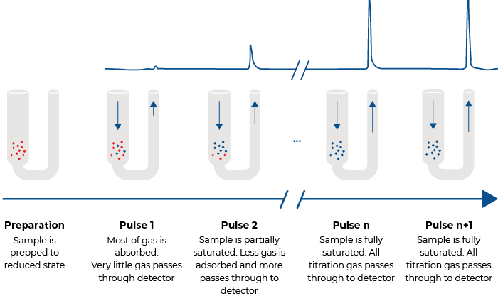 脉冲化学吸附是一种流动气体技术,通常在环境压力下进行。在惰性气体流中预处理样品,注入少量吸附质直到样品饱和。校准好的热导率检测器(TCD)用于测量每次注射时活性位点吸附的吸附质分子量。初始注射可能发生完全吸附。吸附饱和后,再次注射不会发生化学吸附。化学吸附的气体分子数与材料的活性表面积直接相关。