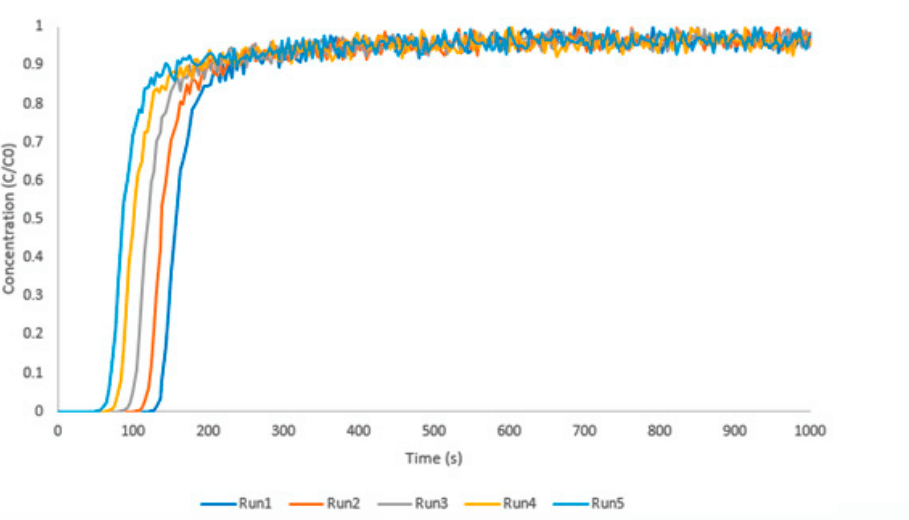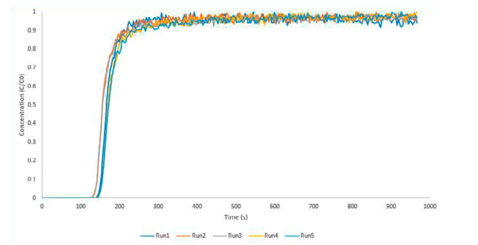 图1显示了连续5次干燥条件下CO2吸附实验的穿透曲线。为了清晰起见,实验中的死时间已被减去。5次重复后,穿透曲线显示容量并没有损失,CO2平均吸附量为2.87 mmol/g。此外,穿透曲线的斜率非常陡峭,这意味着系统中几乎没有传质问题。