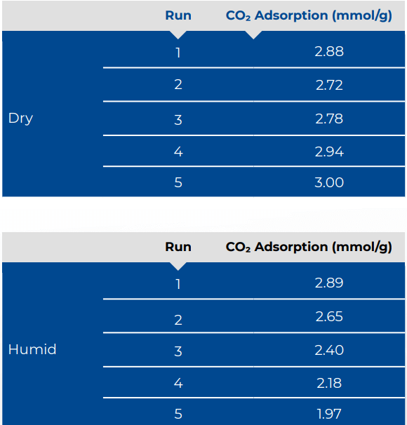 在干燥和潮湿条件下,测定了沸石13X吸附CO2的穿透曲线。在干燥条件下,沸石13X对CO2表现出良好的循环吸附,平均吸附量为2.87mmol/g。在潮湿条件下,水蒸汽降低了沸石13X吸附CO2的能力,如表1 如示,需要更高的活化温度才能完全活化材料。本研究通过穿透曲线分析仪BTA测量了沸石13x的CO2吸附性能。
