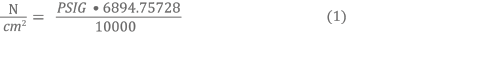 The AccuPyc pressure is written in terms of PSIG. This can be converted to N/cm2 by using equation (1).