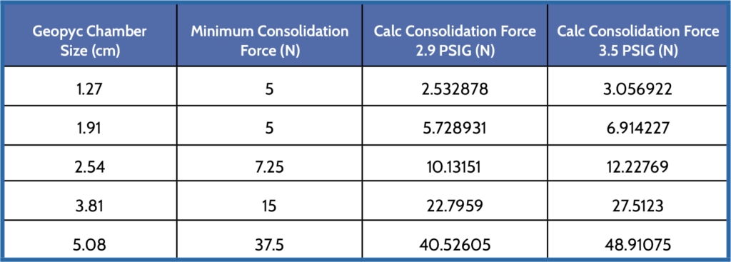 Equation (3) allows a consolidation force to be calculated based on GeoPyc chamber size and the pressure that was used to calculate the skeletal density.