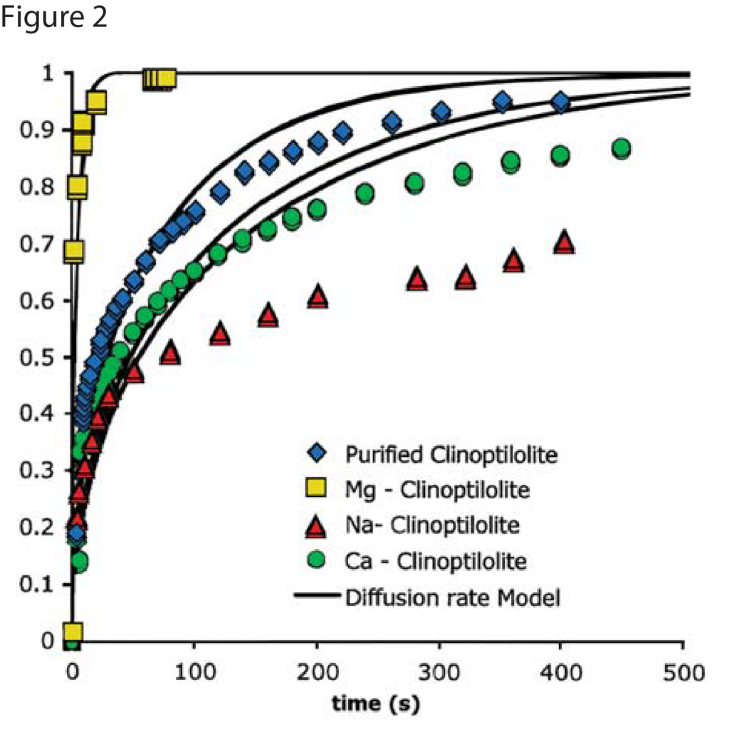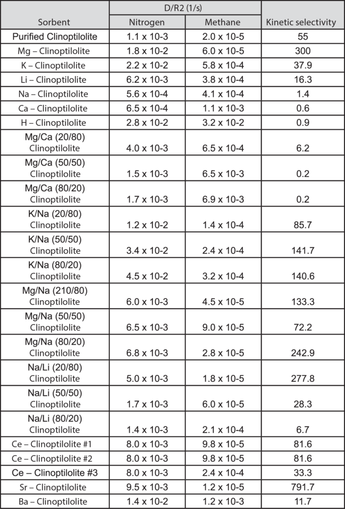 Clinoptilolites have a two-dimensional channel structure with multiple indigenous cations located in these channels that can be systematically altered to get desired adsorption characteristics by performing ion exchange [5]. One of the objectives of this work is to prepare mixed ion-exchanged clinoptilolites (i.e., partially exchanged clinoptilolites) and test their effectiveness for CH4 enrichment by means of adsorption measurements. In this study various ion-exchanged forms of clinoptilolites are prepared and the low-pressure adsorption kinetics of nitrogen and methane in them is studied using Micromeritics’ ASAP 2010 (constant volume apparatus).