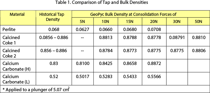 As is to be expected, bulk densities generally increase as the consolidation force increases. GeoPyc T.A.P. densities (as shown in Table 1) typically replicate tap densities between consolidation forces of 5 to 15N, when applied through a plunger of 5.07 cm2 cross section ( ie: consolidation of 1 to 3N/cm2). The GeoPyc determines the sample’s volume at the desired degree of compression, then the sample’s weight is used to calculate its bulk density.