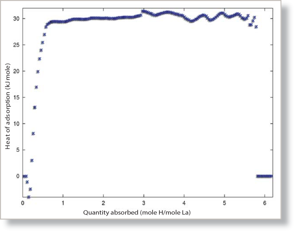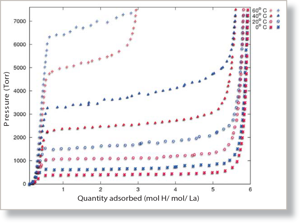 Lanthanum pentanickel (LaNi5) is a metal alloy that, under the correct pressure and temperature conditions, will rapidly sorb hydrogen gas and form a metal hydride compound. Hydride forming metal compounds are well known for their ability to sorb large amounts of hydrogen gas at a specific pressure, store it, and later release the hydrogen at a different, lower pressure. This sorption behavior leads to a distinct “plateau” when hydrogen reacts with the LaNi5, a reaction that is highly dependent on temperature, as demonstrated by the pressure composition isotherm, Figure 1. By using the isotherms collected at different temperatures, a heat of adsorption report can be generated, a report that gives some insight to the reaction mechanisms of the LaNi5-hydrogen system.