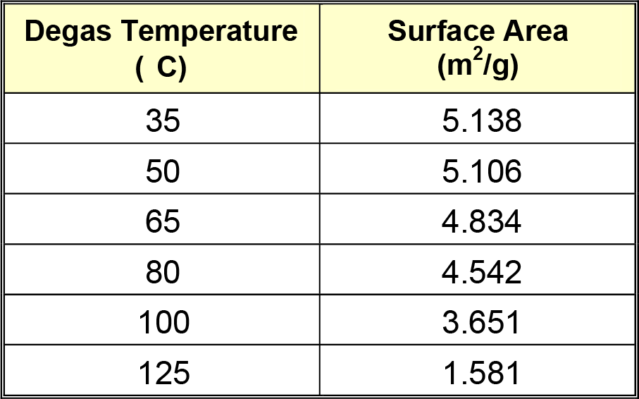 An example of this sample preparation protocol is seen on the following page. One sample was prepared or degassed for four hours at the temperatures indicated in Table 1. The resulting surface areas are listed to the right of the degassing temperatures. These data are shown in graphical format below the table.