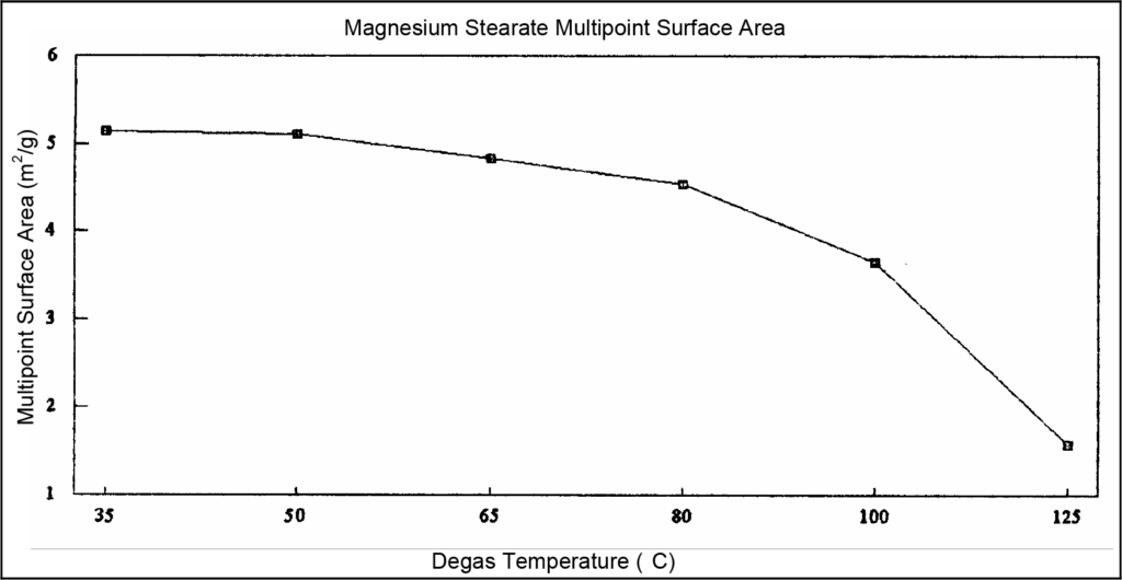 As shown in the above data, magnesium stearate should not be degassed at temperatures above 35 °C because melting and sintering, which lower the measured surface area, occur at higher temperatures.