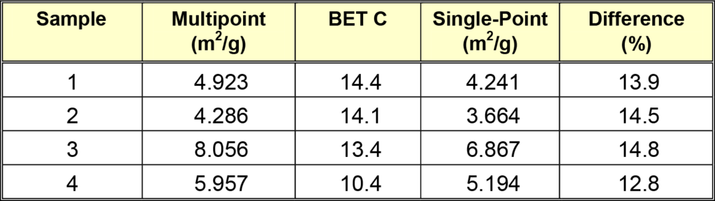 The Difference column in the table above was calculated by subtracting the single-point value from the multipoint value and determining its percentage of the multipoint value. It illustrates the magnitude of the error associated with estimating the surface area by using the single-point technique. This magnitude of error is expected for BET C values as low as determined here. In general, BET C values are between 5 and 20 for organic materials. The error in the single-point analysis of these materials is too large for accurate surface data comparison to be made between laboratories or investigators.