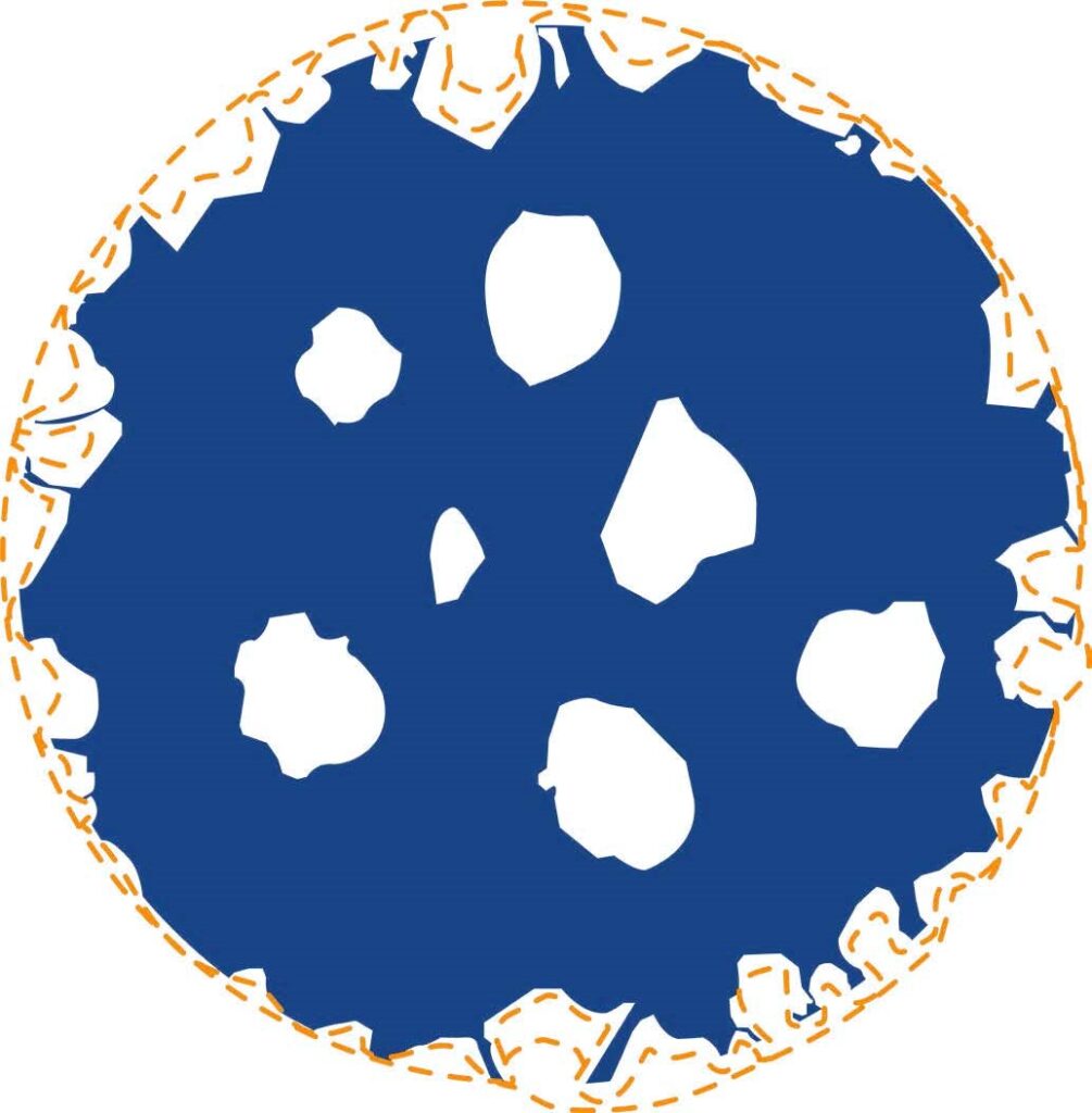 Envelope density assessment requires that a critical distinction be made of where surface irregularity or roughness ends, and where internal porosity begins. Envelope density results always depend on the classification of void spaces as either pores or surface irregularities. Consider, for example, the illustration below, which depicts a two-dimensional cross-section of a typical sample object that is both porous and irregular in shape.
