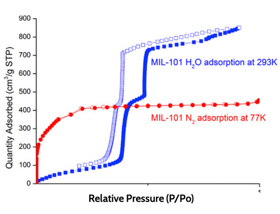 另一方面,MIL-101 的水分主要来源于较高的相对湿度,P/P₀ > 0.35,这与其介孔性质相一致。MIL-101 在 P/P₀ > 0.3 时的水容量为 96.2 cm³/g STP (7.7 wt.%),在 P/P₀ = 0.90 时的水容量为 850.5 cm³/g STP (68.3 wt.%)。尽管 MIL-101 可能不适用于低湿度环境下的水捕集应用,但它可以用于静态条件下的除湿,例如用于干燥剂中。回滞环是由于毛细管凝聚引起的孔填充造成的。在 P/P₀ = 0.35 到 0.5 的较窄的相对湿度范围内,630cm³/g STP (50.6 wt.%) 吸水量的巨大差异揭示了其在吸附式热泵或冷水机的潜在应用 ¹⁴。在较高的压力和温度下,可以消除滞后现象,从而产生更窄的相对湿度范围,使其更适合上述应用。